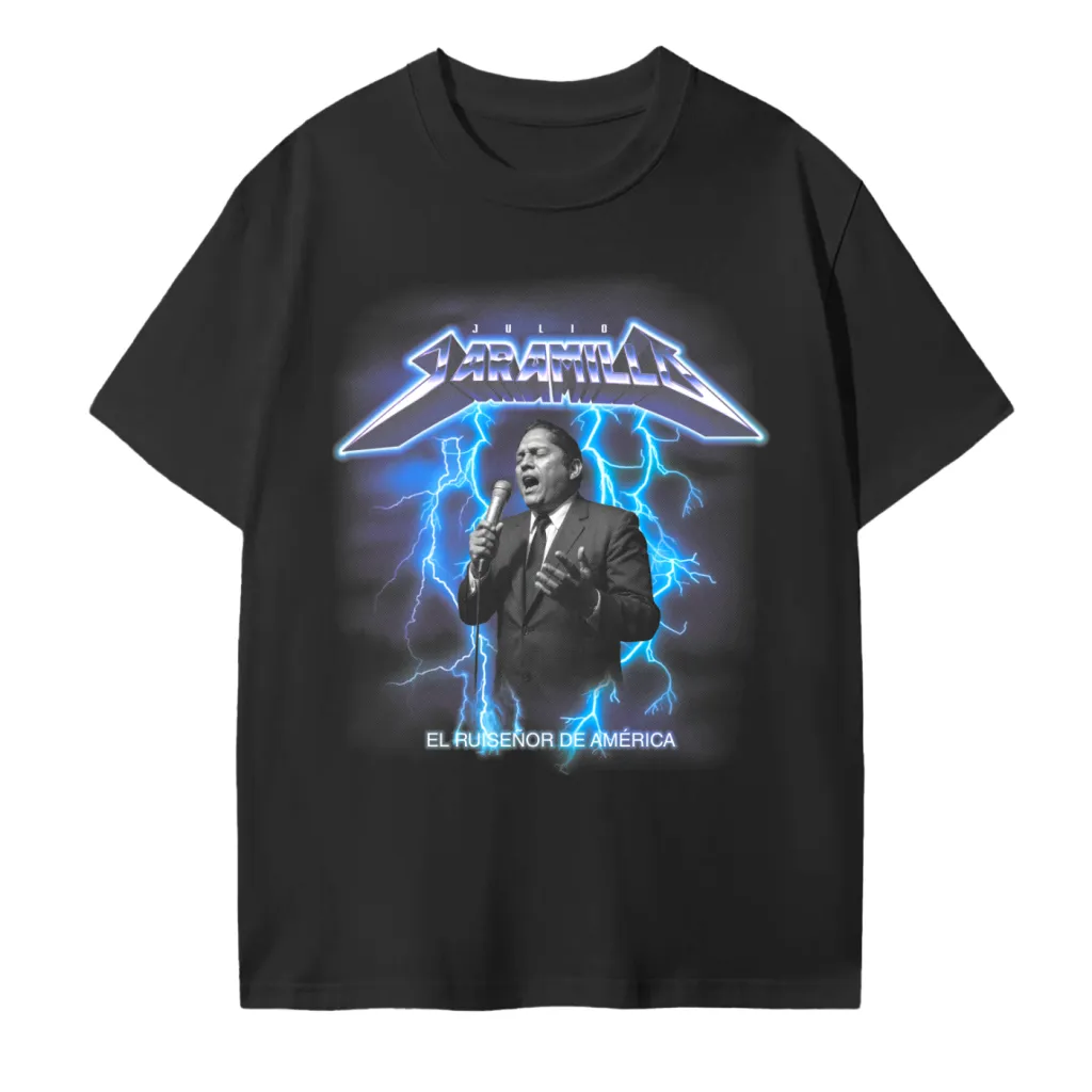 Camiseta Julio Jaramillo metal, el Ruiseñor de América, inspirada en icónico el diseño de la portada Ride the lightning de Metallica